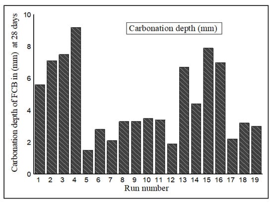 Consequently, the carbonation depth performance on run numbers: 4, 10 and 17 with the densities 1300 kg/m3, 1550 kg/m3 and 1800 kg/m3 were 9.2 mm, 3.8 mm and 2.1 mm at 28 d, respectively as shown in Figure 7. However, the density was not the only factor that caused a significant effect on the increase or decrease of carbonation depth in FCB. Nevertheless, the change of carbonation depth on FCB that has the same density is unusual except due to some reasons. Temperature and CO2 concentration along with curing conditions also altered the carbonation depth of FCB when the density held on some runs. For example, the highest carbonation depth was 9.2 mm at run 4 with 1300 kg/m3, 40 °C and 20% of CO2 concentration, while for the density at run 1, the carbonation depth was 5.6 mm when the temperature and CO2 concentration were at 27 °C and 20%, respectively. Similarly, the carbonation depth of runs 7 and 8 are 2.1 mm and 3.2 mm at the density and temperature 1800 kg/m3 and 40 °C, respectively. However, the concentration of CO2 changed from 10% and 20%, respectively. This finding has demonstrated the effect of CO2 concentration on the increase carbonation depth of FCB.