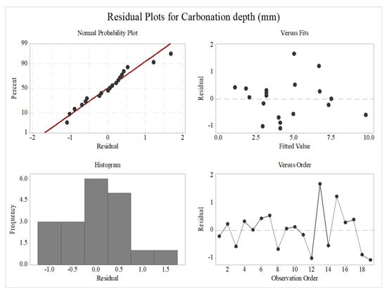 In factorial design, the ANOVA conclusions can only be accepted when the adequacy of the underlying model has been evaluated. The primary diagnostic tool to gauge the model adequacy is residual analysis. The residual data or the measured errors should demonstrate normal distribution, independent distribution, zero mean value and constant variance σ2 at all runs. If all residuals satisfy the aforementioned requirements, so that the F0 ratio will follow an F distribution that will lead to accurate ANOVA results. Furthermore, the effects of nuisance factors will be excluded from the analysis []. In this study, the residual plots of normal probability were used to indicate whether the model meets the assumptions of the analysis or not []. As can be seen in Figure 8, the normal probability plot (NPP) shows the majority points cluster to a straight line and this indicates the residual distributions are likely to be a normal and hence the model meets the assumption. On top of that, the fine segregation of the points around the normal probability line demonstrates a precise prediction of the carbonation depth of FCB. Meanwhile, the versus fits in residual plots present the scattered values about zero and no obvious pattern can be observed. In addition, only two points are slightly departed from the red line in the NPP, in which the errors can be assumed as normal [], whereas the allowable error of the findings is <5% to reflect a high level of accuracy in the data analysis [].