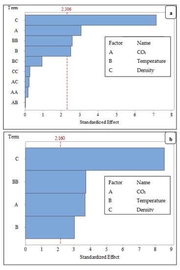 Pareto chart of the standardized effects at a 95% confidence interval on carbonation of FCB (a) before removing non-significant terms, and (b) after removing non-significant terms.
