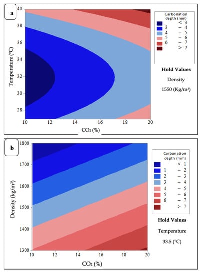 The contour plots shown in Figure 10a,b depict the effect of the parameters on carbonation depth of FCB. The contour plot is one of the most useful plots in RSM used to demonstrate the effect of two factors and holding the other factors. The plots exhibit layers with different gradually changing colours indicative of the possible independence of factors with a response. The contour plots depict the graphical relationship of two factors, i.e., density and temperature over the carbonation depth of FCB, while the CO2 concentration is held at the centre value.