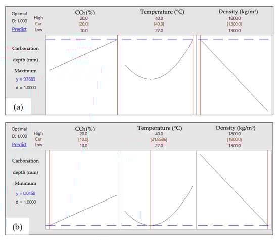 Optimization plot of FCB at 28 days (a) at the maximum target of carbonation depth, and (b) at the minimum target of carbonation depth.