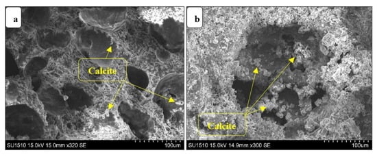 SEM images were used to identify the morphology characteristic of FCB samples that are related to the density aspects and curing conditions. Images show, after 28 days of carbonation, the formation of calcite (CaCO3) in FCB, Figure 12a,b. The results revealed that a low level of calcite formation was represented in the specific surface area of carbonated FCB that cured at low temperature and CO2 concentration 27 °C and 10%, respectively, as shown in Figure 12a. In contrast, the increment of temperature and CO2 concentration to 40 °C and 20% were playing a vital role in the formation of calcite in FCB, as presented in Figure 12b. As expected, a great deal of hydration products mainly consisting of C-S-H formed via carbonation resulting healing of FCB pores []. However, the pores cannot be totally healed in 28 days due to the high level of porosity in the FCB, which has a low level of density compared to normal concrete bricks as demonstrate in SEM images. This finding confirmed the finding of the previous studies, the carbonation process is slow therefore, its takes time to heal the pores via precipitated CaCO3 [,]. Overall, the microstructural analysis of FCB confirms that the carbonation reaction has the ability to decrease the porosity by formation of CaCO3, which in turn increase with the increasing of temperature and CO2 concentration.