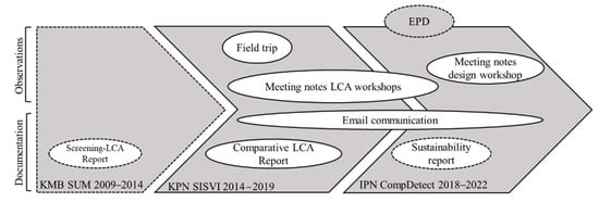 A good case study comprises multiple sources of evidence [43]. This study relied on several data sources such as documentation (emails, meeting notes, reports), direct observations of meetings and workshops as well as participant observations (in which the researcher is an active participant) gathered during the time 2014–2021. Figure 2 shows the period for this longitudinal case study. It started with a research project in 2009—Sustainable Manufacturing of Light Weight Solutions (KBM SUM)—where a screening LCA was performed with the goal of evaluating the environmental impact of different EOL options for the product. The researchers were not an active or observative part of this research project; the report from the LCA-screening was analyzed as a secondary data source. From 2014 to 2019, the company was part of a competence project called Sustainable innovation and shared value creation in the Norwegian industry (KPN SISVI). The researcher’s involvement with the case company started in this competence project in 2014; consequently the data collection with the researchers as active participants started, i.e., primary data sources. The data sources from this research project ranged from meeting notes and observations, field trip to email communication. Further, a comparative LCA was performed during the project period, and the report is one of the data sources analyzed in this case study.