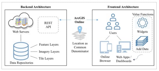 Spatial mashups were spawned after the advent of Asynchronous JavaScript and XML (AJAX) technologies, which are used to send and receive datasets from a remote server without disrupting user interactions. The success of AJAX led to the development of various Application Programming Interfaces (APIs), which allowed combination of remotely sensed and user-defined local data to create customized mashups. APIs provide software-to-software capabilities, beyond the traditional user-to-software interactions, thereby facilitating combination of different web services and rapid retrieval and linkage of numerous online repositories simultaneously [12]. ArcGIS Online, which is a core component of the approach used in this study, is an example of a widespread geospatial mashup that leverages API technologies to connect users with data and additional interactive capabilities, including widgets and spatial tools, to foster communication and collaboration across disciplines. In ArcGIS Online, numerous maps and map servers are packaged through a standardized interface known as the Representational State Transfer (REST) API. This service-based architecture allows for a bridging of the knowledge gap between data and users, thereby facilitating engagement of multiple disciplines across varying scales [12]. This geospatial architecture is demonstrated in Figure 1.