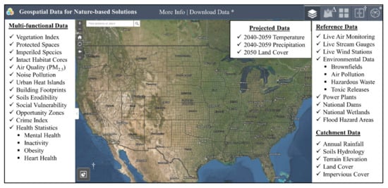 Data availability is referenced throughout the manuscript and within the Supplementary Materials, according to available content at the time of publication. All pertinent datasets as provided by the hosting agencies are credited on the NBS-Geo home page (https://tinyurl.com/nbsgeohome, accessed on 3 October 2021). Users can browse this web-page and click on any of the associated links for more information regarding each dataset attributors, underlying assumptions, limitations, descriptions, terms of use, and dates of service. At the time of publication, all data layers described in this article were current within the Esri Living Atlas data repository; however, datasets may become depreciated by the hosting agencies at any time. The author(s) will maintain the site to link data updates, as available. In the event this site is no longer maintained due to widespread data depreciation, the general framework presented here for multi-functional geospatial data curation, by transposing themes of society, environment, hydrology, and ecology, is encouraged for further development and application.