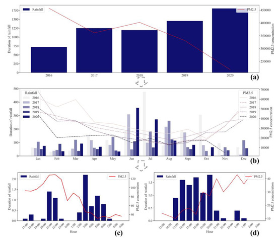 Macro/micro-temporal scale of sustained rainfall-PM2.5 observation data series and removal phenomenon in Nanjing from 2016 to 2020: (a) Yearly temporal-level; (b) Monthly temporal-level; (c,d) Hourly temporal-level.