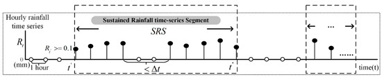 Time-series segments (TS) are mathematical frameworks for describing and modeling event sequences in the time domain, and are commonly used to construct interpretable time-series analysis models, such as trend prediction and anomaly detection [31,32]. In this paper, the sustained rainfall time-series segment (SRS) is defined at the micro-temporal scale rainfall: . SRS visualizes the variation of rainfall in the time dimension of a sustained rainfall process, as shown in Figure 2, and is defined as follows:
