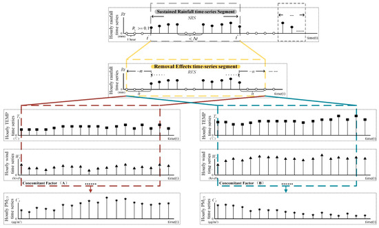 Firstly, according to the definitions of the and proposed in Section 3.1, a small-scale sliding window is applied to process the hourly rainfall time series , hourly PM2.5 time series and hourly meteorological observations, setting up to capture all of the sustained rainfall processes in the historical data [40].