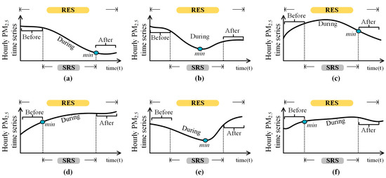 On this basis, the removal effects time-series segment (RES) is defined in conjunction with the PM2.5 time series. The RES refers to the process and subsequent effects of rainfall on PM2.5 at the scale of the mechanism of removal, while avoiding the chance of PM2.5 concentration values before rainfall anomalies by expanding the series values for and forward and backward for hours, respectively (Figure 3):