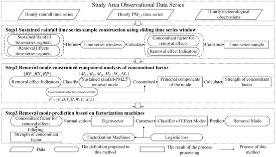 In this section, based on the quantitative model of sustained rainfall-PM2.5 removal mode, the future rainfall is further fitted using a multiple regression to fit the removal modes, the core steps are as follows (Figure 5): Step 1, using the time-series window according to the constitute time-series sample of removal modes with high-dimensional characteristics; Step 2, extracting the principal components and component features of the pattern classification features through the principal component analysis method for the concomitant factor intensity; Step 3, establishing factorization classification regression machines for removal modes according to the factor intensity, which can predict the removal phenomenon based on the future meteorological and current air quality information.