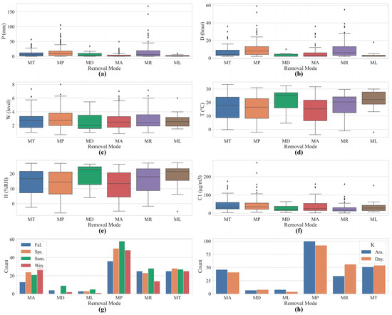 Distribution of the numerical distribution of concomitant factors for different removal modes. (a) Rainfall Total and removal modes; (b) Rainfall Duration and removal modes; (c) Wind Power and removal modes; (d) Temperature and removal modes; (e) Humidity and removal modes; (f) Initial PM2.5 and removal modes; (g) Seasonal factor and removal modes; (h) Day and night factor and removal modes.