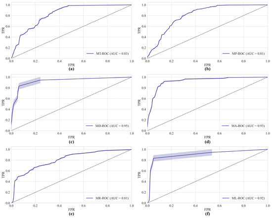 The ROC and AUC of removal modes classifier, (a) ROC of Totally Removal Mode; (b) ROC of Removal Mode; (c) ROC of Delayed Removal Mode; (d) ROC of Totally Ascend Mode; (e) ROC of Rebounding Ascend Mode; (f) ROC of Lasting Ascend Mode.