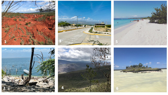 In 1945, the Alcoa Exploration Company was granted a concession for the open-pit mining of bauxite, which started in 1958. It constitutes one of the oldest economic activities with the most significant environmental and economic impacts on the southern slope of the Sierra de Bahoruco, specifically in the community of Las Mercedes in the province of Pedernales [21] (p. 69). It was the first large-scale international mining operation in the DR [22] (p. 222), and it has continued, albeit with less intensity, until the present. In addition, its present activities have diversified to include the manufacture of cement, which is derived from the limestone quarries around Cabo Rojo and Las Mercedes. The Jaragua National Park (conservation zone 3) was created in 1986 through Presidential Decree 157-86 and was ratified with its current limits by sectorial law 202-04. Within its area lies one of the most emblematic sites of the RBJBE, the Bahía de las Aguilas, which is possibly one of the most important nesting sites for sea turtles in the Western Hemisphere. It supports species such as the leatherback, hawksbill, green turtle, and scattered populations of the West Indian manatee, an endangered species [23,24]. The natural wealth and the beauty of the Jaragua National Park have transformed certain places in the Reserve into attractive places for tourism development. Figure 2 shows some key sites of the RBJBE, a mosaic of natural resources exploitation, climate crisis, rich biodiversity, and opportunities for sustainable development.