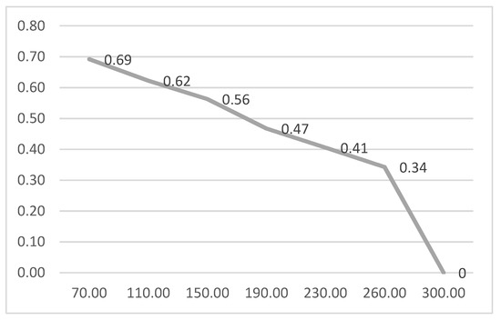 The results in Table 2 were used to generate a probabilistic survivor function; the function assumes the reasonable top bid of DOP 300.00, which operates as a “truncating point” [63]. Figure 3 shows the probabilistic survivor function for RBJBE; it is monotonically decreasing as expected [55].