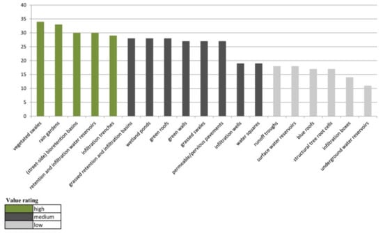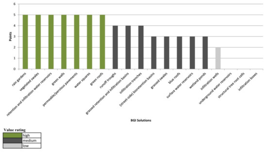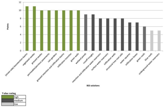 The group with a medium spatial and functional value included 9 BGI solutions (47.37%): wetland ponds, runoff troughs, retention and infiltration water reservoirs, surface water reservoirs, infiltration wells, structural tree root cells, water squares, infiltration boxes, and green roofs. Most of these require a large area for implementation, generate high construction costs, and there are further factors that prevent their introduction into selected types of urban space. However, these limitations are compensated for when recognizing their significance in shaping the space, performing additional functions apart from stormwater retention, and relatively slow degradation over time, due to which these solutions obtained an average number of points (6 to 9).