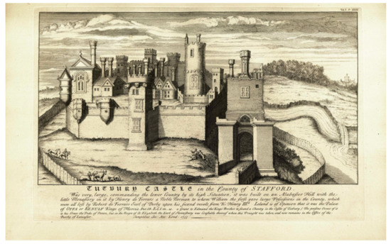 Plate 1.39 of Vetusta Monumenta depicts Tutbury Castle as it appeared in the sixteenth century. Engraving by George Vertue after a drawing originally produced for a survey of the properties of the Duchy of Lancaster conducted by the Chancellor of the Duchy, Ambrose Cave, in 1561. Further drawings from this cache were engraved as Plates 1.40, 1.41, 1.42, 1.44, 1.46, 2.11, and 2.13. 304 × 467 mm. Published by the Society of Antiquaries of London in 1733. Current location: Tutbury, Staffordshire, UK.