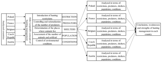 Hence, this article aimed to critically analyse the solutions in force in the Polish hunting management system in recent years with the solutions in Austria, Belgium, the Czech Republic, and France, aimed at optimising the existing legislative solutions in Poland. The assumption was made that legal regulations allowing for the control of significant areas determining the implementation of wildlife management will allow both the preservation of biodiversity and sustainable development expressed in sustainable consumption. The selection of the countries indicated for the comparative analysis was not accidental. Each of these countries has struggled with different hunting problems over the last century, and in each of them, different solutions have been introduced [8,14,15,16].