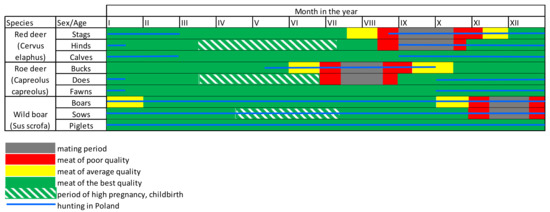 Chart showing the hunting season and meat quality of selected species of large game during the year in Poland. Source: Own study.