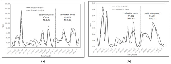 Five sensitive parameters were identified: ERORGN, NPERCO, SDNCO, PHOSKD, and PPERCO. Each sensitive parameter was manually calibrated, and the optimal values are listed in Table 6. The comparison of measured and simulation values in calibration and verification period is provided in Figure 4. During the calibration period, the R2 values of TN and TP were 0.81 and 0.72, respectively, and the NS values of TN and TP were 0.75 and 0.65, showing a close agreement between the measured and simulated values. During the verification period, the R2 values of TN and TP both reached 0.4 and met the criteria (for TN, R2 value was 0.7, and for TP, R2 value was 0.75), and the NS values of TN and TP both exceeded 0.35 and met the criteria (for TN, NS value was 0.63, and for TP, NS value was 0.71), which was considered acceptable and applicable for future application in this study.