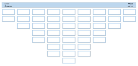 The statements were printed on individual cards [86], that the participants were asked to rank-order from “Most disagree” to “Most agree” on a Q-sort diagram (Figure 1). The study used a symmetrical diagram, as is usually preferred in Q-methodology. Following Stainton Rogers [87] a 9-point ordinal scale was employed.