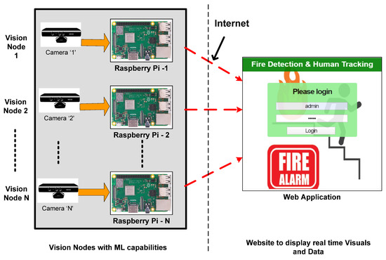 The architecture comprises three components, namely, Raspberry Pi, Kinect sensor, and web application. Generally, Raspberry Pi used with a Kinect sensor empowers the implementation of a vision-based system for sensing visual data such as images and videos. A web application is developed for visualizing real-time data that is obtained from the vision node as Raspberry Pi is integrated with a web application through a local server enabled via the internet. The real-time detection of fire and people count estimation is achieved with the vision node because it is loaded with a machine learning (ML) model, i.e., a deep neural network. The real-time result regarding fire detection and people count is communicated with the web application through the local server.