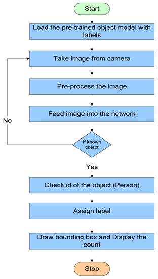 The procedure of fire detecting and people count estimation are illustrated in Figure 6 and Figure 7. People count estimation is implemented with DNN after the training model according to Figure 6. People recognition and counting are achieved through the following sequential steps: Initially, the pre-trained object detection model with labels is loaded. When the camera captures the image as an input, it is fed into the DNN network after pre-processing. Here, the network decides whether the object is known or not. In the case where the object is unknown, it starts taking a picture. In the case where the object is known, it assigns a label and draws the bounding boxes for all detected objects and counts the labels. Finally, it displays the count and repeats the process.