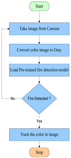 Similarly, detection of fire is implemented with DNN after the training model according to Figure 7, and sequential steps are explained as follows: In the initial stage, the camera captures the image as input, and pre-processing is applied to the image. Here, the color image is converted into grey color, and the pre-trained model for fire detection is loaded. The image is fed to the DNN network, where it decides whether the object in the image is a fire or not.