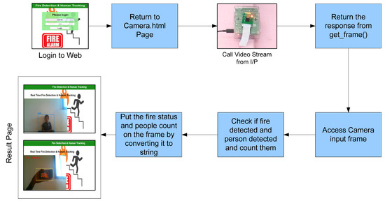 The login window of the application is shown in Figure 8. Only authorized personnel with proper credentials can obtain access to the entire system. To trigger the vision node, we need access the login web portal. As we login to the web portal successfully, all the vision nodes deployed inside the building connected through the internet will be deployed. Once they connect successfully, vision nodes start streaming live visuals along with estimated data such as fire detection status and people count, as shown in Figure 9. The detailed stages involved in the end–end workings are illustrated in Figure 10.