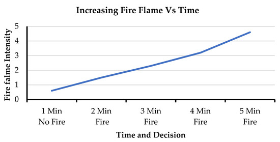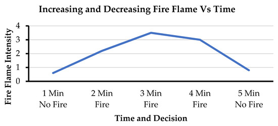 In the third scenario, we have tested our system with frames with increasing and decreasing fire flames and received the results shown in Figure 14. In the last case, we have tested the system with frames with random fire flame intensities, and we obtained the results shown in Figure 15. In Figure 12, Figure 13, Figure 14 and Figure 15, the y-axis represents scaled fire flame intensity, and the x-axis represents time in minutes and decision.