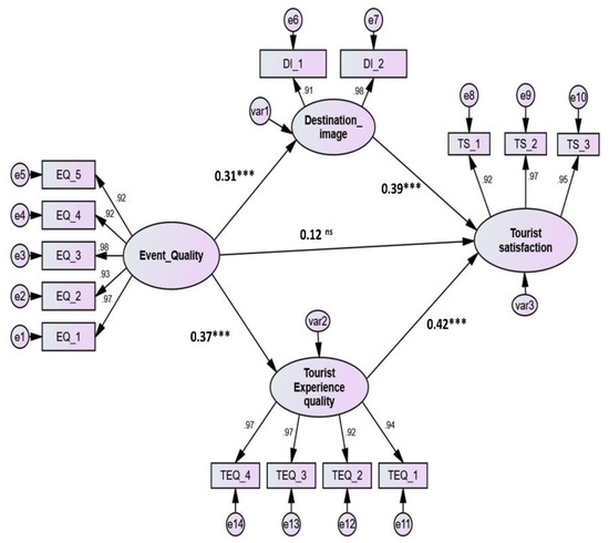The results also showed that destination image and tourist experience quality fully mediated the impact of event quality on tourist satisfaction, as the direct path was insignificant while the indirect paths were positive and significant as argued by Zhao et al. [44], thus hypotheses H6, and H7 were supported.