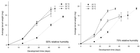 Average larval weight (mg ± SE) of Alphitobius diaperinus larvae reared on wheat bran at three temperatures (25, 30 and 32 °C) and two relative humidity levels (55% (left) and 75% (right)) (n = 6) (Bioassay I).