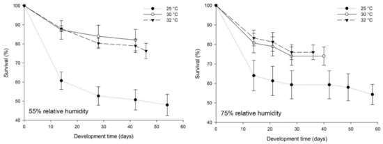 Survival (% ± SE) of Alphitobius diaperinus larvae reared on wheat bran at three temperatures (25, 30 and 32 °C) and two relative humidity levels (55% (left) and 75% (right)) (n = 6) (Bioassay I).