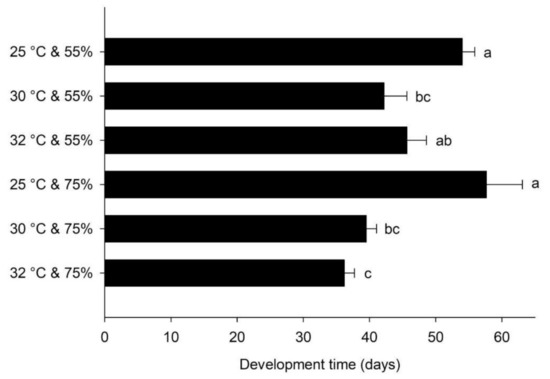 Development time (days ± SE) of Alphitobius diaperinus larvae reared on wheat bran at three temperatures (25, 30 and 32 °C) and two relative humidity levels (55% (left) and 75% (right)). Bars followed by the same lowercase letter are not significantly different. In all cases, n = 6; df = 5; p = 0.05 (Bioassay I).