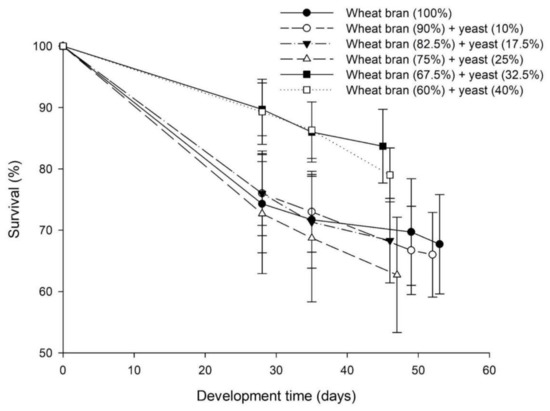 Survival (% ± SE) of Alphitobius diaperinus larvae reared on mixtures of wheat bran with different percentages of yeast (0%, 10%, 17.5%, 25%, 32.5% and 40%) (n = 6) (Bioassay II).