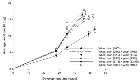In this series of bioassays, diets with different percentages of protein content were designed and evaluated. Specifically, the development of A. diaperinus larvae was investigated in mixtures of wheat bran with different percentages of dry instant yeast (0%, 10%, 17.5%, 25%, 32.5% and 40%). The nitrogen content of the wheat bran (2.67%) was determined on a dry matter basis by Kjeldahl analysis (behr Labor–Technik GmbH, Germany, K12-block standard digestion system, programmable infrared digestion device, S4 distillation unit) and was converted to protein using the Jones’ default nitrogen-to-protein conversion factors (Kp) of 6.25 (16.7% protein). For yeast, the nutrient composition information provided by the manufacturer on the product label was used (50% protein), whereas the protein content of the diets tested was calculated by multiplying the inclusion level of each ingredient (wheat bran, yeast) with its protein content and summing these values per diet. Based on the above, the protein content of the diets tested was 16.7%, 20.0%, 22.5%, 25.0%, 27.5% and 30%, respectively. The experimental design described in Bioassays Series I was also followed in this series of bioassays. Briefly, there were 6 replicates per dietary treatment, whereas in all treatments larvae were provided with fresh carrot slices (0.6 ± 0.1 g) three times per week. All vials were kept at constant conditions, i.e., 26 °C, 55 r.h. and continuous darkness, arranged on a bench inside the incubator in a completely randomized design.