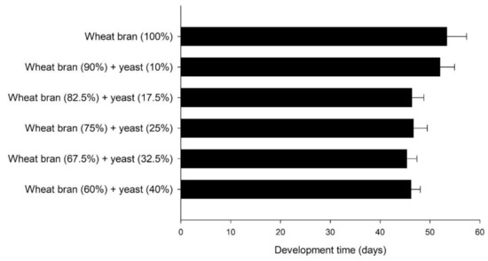 Development time (days ± SE) of Alphitobius diaperinus larvae reared on mixtures of wheat bran with different percentages of yeast (0%, 10%, 17.5%, 25%, 32.5% and 40%) (n = 6). No significant difference was noted among treatments. In all cases, n = 6; df = 5; p = 0.05 (Bioassay II).