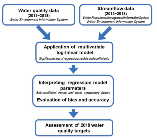 However, in the Republic of Korea, water quality assessment methods that consider environmental factors, such as flow and season, have not yet been actively applied, implying that new water quality assessment methods that consider such parameters are required. Therefore, in this study, the attainment of water quality targets was determined by applying multivariate log-linear models that consider water quality, flow, and season for sites with corresponding data on flow among representative sites in the sub-basin of the Nakdong River. The water quality trend as well as its dependence on flow as a function of time and season were also assessed using model coefficient values. The results of this study contribute to the development of specific water quality management policies that can be applied in the management of water quality influencing factors in future. It is also expected that the method proposed in this study can serve as an objective assessment method that can be employed to identify the effects of water quality management policies on the realization of water quality targets.