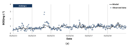 Table 5 shows the results of the analysis of the accuracy of the multivariate log-linear models in predicting 2018 water quality parameters. Overall, the predicted TP concentration values reflected the observed values to a greater extent than the predicted BOD concentration values. Further, the observed values were better reflected at the mid-upstream sites than at the downstream sites, and MAPE was below 50% for all the sites; this is indicative reasonable forecasting. Furthermore, the RMSE values obtained for BOD and TP concentrations were in the ranges 0.3–1.5 and 0.012–0.064 mg/L, respectively, and among the 24 sites, Andong1 and Banbyeoncheon2-1 sites exhibited the highest prediction accuracies for BOD and TP concentrations, respectively, i.e., RMSE values of 0.3 and 0.012 mg/L, respectively (Figure 3).
