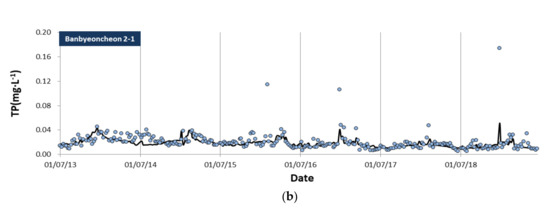 In particular, water quality is related to flow [2,3,4], which may be an important influencing factor for changes in water quality [4]. In the Republic of Korea, simple log-linear models as well as multivariate log-linear models [5] have been applied to clarify the relationship between water flow and quality in the South Han River, North Han River, and Gyeongan Stream, which flow into Lake Paldang; the suitability of these models in this regard has been compared along with the analysis of the water quality trend [6]. Additionally, various studies have been conducted to calculate loads, estimate parameters, and predict suspended particle loads using the LOADEST multivariate regression mode, which is based on log-linear models [7,8,9]. Regarding studies on water quality assessment based on other methods, the attainment of water quality targets has been assessed using the arithmetic assessment method, which only uses total organic carbon (TOC) data [10]. Further, the exceedance of water quality targets has also been assessed by comparing the loads calculated for each section using the load duration curve [11,12,13,14,15]. In other countries, more detailed studies have also been conducted to assess water quality and loads using multivariate statistical models [5,16] that can explain the influence of different factors that contribute to water quality changes, including flow fluctuation, time, and season [17,18,19]. Specifically, Hirsch (2014) [20] investigated the negative effect of the presence of bias in large datasets on items, such as dissolved nitrate and TP contents using the five-parameter LOADEST model (L5), the seven-parameter LOADEST model (L7), and the weighted regression on time, discharge, and season (WRTDS), which are based on the multivariate regression model developed by Cohn et al. (1992) [5]. Furthermore, in 2019, the U.S. Geological Survey (USGS) analyzed the suspended sediment, total nitrogen, and TP contents as well as loads of the Kankakee River, which is located in Shelby (India), using regression analysis [21]. In Japan, the 75 percentile is applied when evaluating the degree of achievement of organic substances, and if it is satisfied, it is considered that the target standard has been achieved [22].