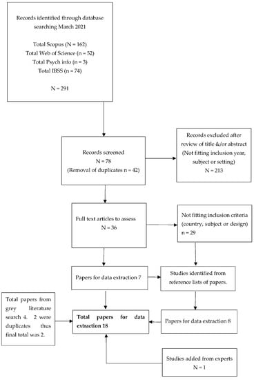 - Cooper, C.; Booth, A.; Varley-Campbell, J.; Britten, N.; Garside, R. Defining the process to literature searching in systematic reviews: A literature review of guidance and supporting studies. BMC Med. Res. Methodol. 2018, 18, 1–14. [Google Scholar] [CrossRef]
