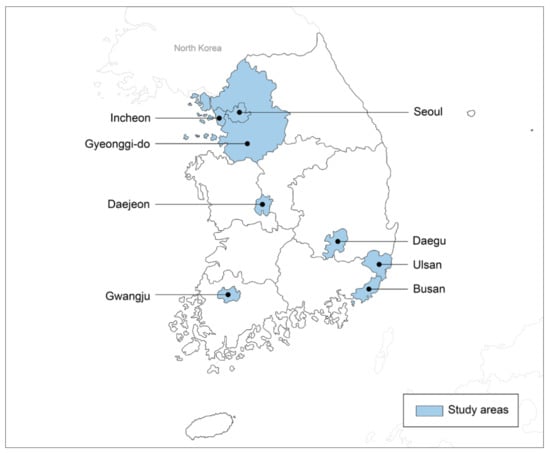 As this study focused on the housing cost burdens of young renters, the residential locations were limited to the CR (Seoul, Incheon, Gyeonggi-do), and the five non-CR metropolitan cities (Busan, Daegu, Gwangju, Daejeon, Ulsan) which were known to have a greater proportion of young adults compared to the rest of the area’s population and higher rental costs than other non-CR “Do” areas [15,46]. According to the Population Census of Korea 2020, the population aged between 20 and 39 years with Korea nationality measured at 13,243,592, and 73.1% of them lived in the area of study: the CR and non-CR metropolitan cities (Table 4). The number of young adults aged between 20 and 39 years and living in the study areas measured at 9,677,985, and 29.2% of them were in Seoul, 44.6% in Incheon and Gyeonggi-do and 26.2% in non-CR metropolitan cities. Considering the census distribution, this study’s sampling was designed to be concentrated at 30% in Seoul, 40% in Incheon and Gyeonggi-do and 30% in non-CR metropolitan cities. Figure 1 shows a map of the study areas.
