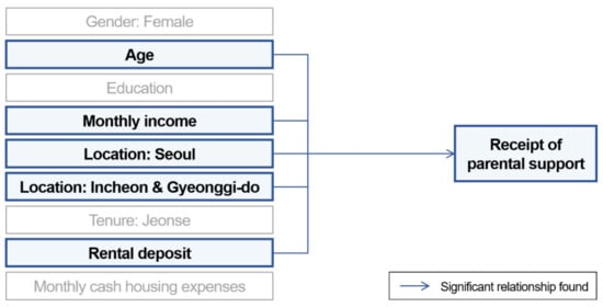 Using a hierarchical regression analysis, the influence of parental support (not received, received) on perceived housing costs burdens was examined with seven variables. These were found to have a significant influence on either the perceived housing cost burdens or the receiving of parental support through a previous discriminant analysis and linear regression analysis (gender: female, age, monthly income, location: Seoul, location: Incheon and Gyeonggi-do, rental deposit, monthly cash housing expenses controlled). As a result, the receiving of parental support did not show any significant influence on perceived housing cost burden at the p < 0.05 level when gender, age, residential location and housing costs were controlled for (p of F-change= 0.132).