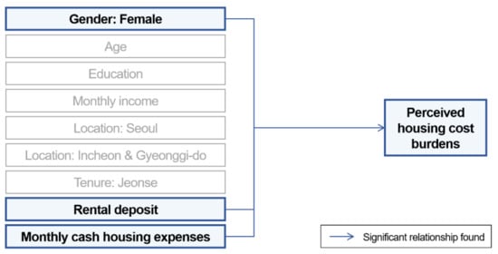 The influence of socio-demographic and housing characteristics on perceived housing cost burdens were examined using a multiple regression analysis with a stepwise method. The dependent variable was perceived housing cost burden measured on a 6-point scale (not burdensome at all (1)—very burdensome (6)), and the independent variables were the same as those used in previous discriminant analyses (refer to Table 17). As a result, a linear combination of monthly cash rental expenses, gender and rental deposit was found to explain 5.8% of the total variance of the perceived housing cost burdens of young renters (Table 20 and Table 21). When looking at the standardized coefficients, the amount of monthly cash housing expenses showed the strongest influence on perceived housing cost burdens. No collinearity problems were observed when looking at the tolerances and VIFs of the variables used in the final-stage regression model. The final-step regression model is summarized in Figure 3.