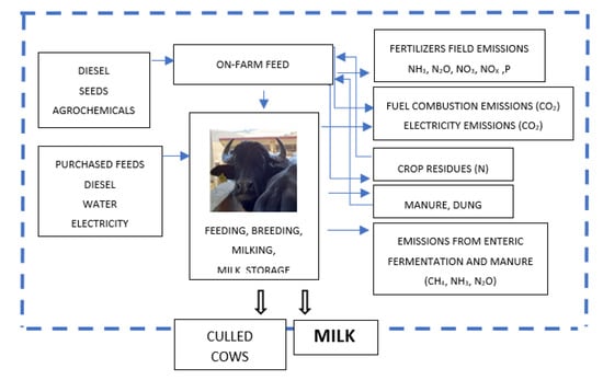 The system boundaries considered in the study were comprised “from cradle to farm gate” (Figure 1 and Figure 2). All the on-farm operations (e.g., animal feeding and care, milking procedures) and sources pertaining to forage production (e.g., arable land, agrochemicals, water) were considered. The consumption of energy and the emissions from activities conducted off-farm were retrieved from databases provided by SimaPro 8.03 []. The transport of off-farm feeds, fossil fuels and bedding materials and their emissions were also included in the assessment.