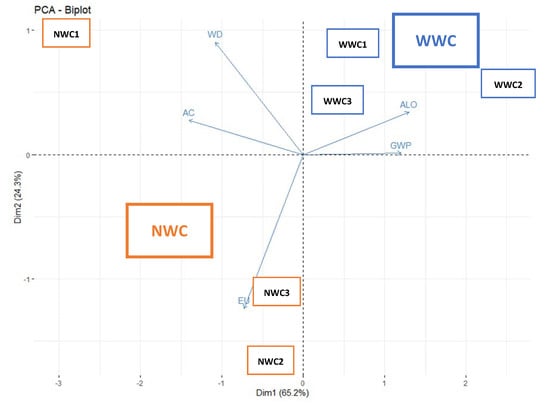 In the PCA biplot (Figure 3), the NWC1 farm showed, as indicated in Table 7, a different profile from the other NWC farms, with lower m3 equivalents. Despite the absence of irrigated crops (corn), WD could be explained by information acquired from the interviews: drinking water (human use) was indicated as an exclusive source, also adopted to clean the milking parlor. Although the NWC1 and WWC1 farms are characterized by a total absence of crop sources of grain (e.g., oat, barley, maize), additionally the NWC1 farm suffers from a lack of self-supply of forages (all the alfalfa and almost 50% of meadow hay were purchased).
