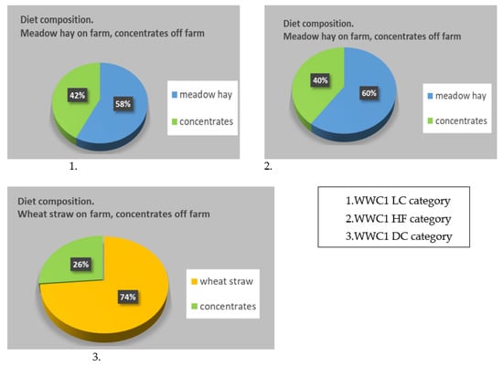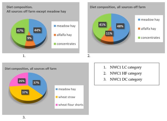 In addition, although the emissions of ammonia from manure management are recognized as significant contributors to acidification [,], the farms investigated in this study showed comparable manure handling, and the highest values observed in the NWC1 farm suggested a clarification. Research focused on dairy cattle [] highlighted that the contributions to acidification were spilt among feed productions (both on- and off-farm), with a share of 31–57%. Moreover, Bragaglio et al. [] found that the largest source of SO2 equivalents is the production of concentrates. The purchasing of off-farm feed (total amount of concentrates, alfalfa hay, straw and more than 50% of hay meadow) concerning the NWC1 farm would explain the high AC value. In Figure 4 and Figure 5, an explanatory comparison of feed sources between NWC1 and WWC1, the two farms without corn silage, is also given.