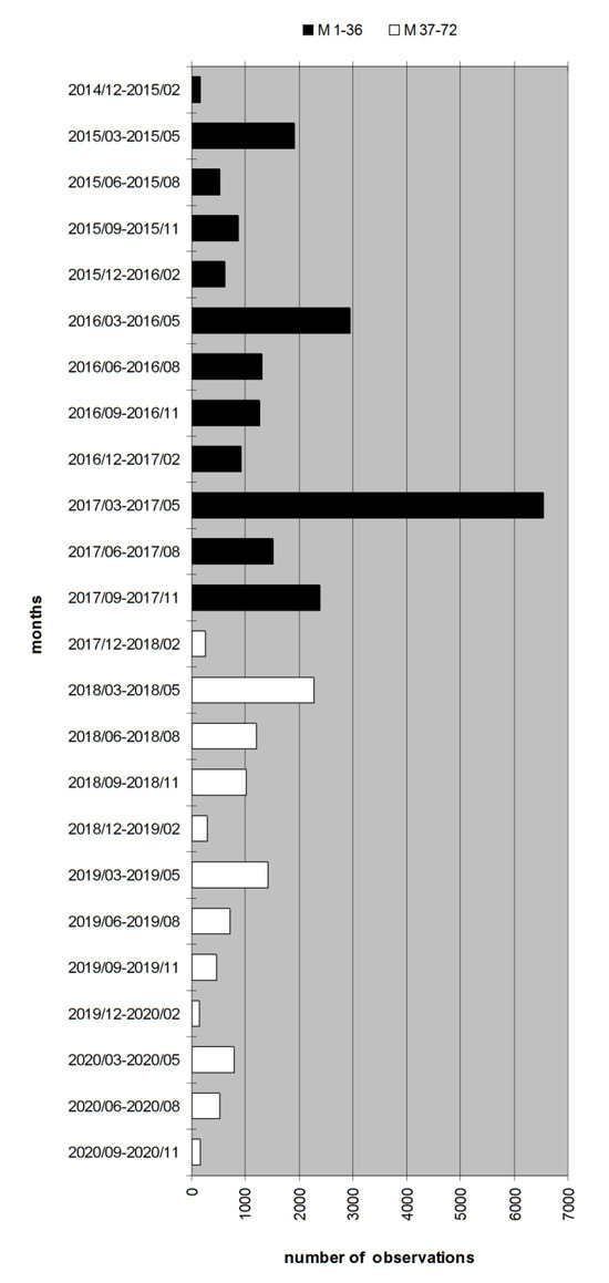 Trend of observations per three-month periods. M 1–36 (black bars) refer to the funded period, while M 37–72 (white bars) refer to the follow-up.