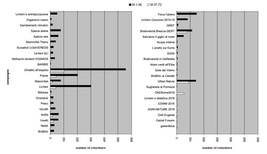 The distribution of volunteers in campaigns is reported in Figure 2. The most participated overall was “Chiedilo all’esperto” (Ask the expert), with ca. 560 volunteers, followed by the “Licheni” (Lichens) and “Piante” (Plants), with ca. 300 and 200 volunteers, respectively. The most participated campaigns in M 37–72 were “Chiedilo all’esperto” (Ask the expert) and “Urban Nature” (ca. 100 volunteers). The only campaigns with similar participation in both periods were “Biodiversità Brescia GERT” (Biodiversity in Brescia) and “Urban Nature”.