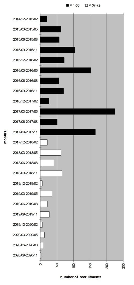 Trend of new recruitments per three-month periods. M 1–36 (black bars) refer to the funded period, while M 37–72 (white bars) refer to the follow-up.
