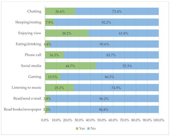 The types of activities performed during trips are summarised in Figure 1. Most respondents were using social media (44.7%), enjoying the scenery (38.2%), listening to music (25.2%), and chatting with the drivers (MBRS and CBRS) (26.6%). Only a few respondents were gaming (13.48%), eating/drinking (4.4%), reading/sending emails (3.8%), and reading books/newspapers (3.2%) while travelling. MBRS users were likely to perform all these activities during travelling, even though some activities such as eating/drinking, reading/sending emails and reading books/newspapers are undoubtedly difficult for MBRS users to perform.